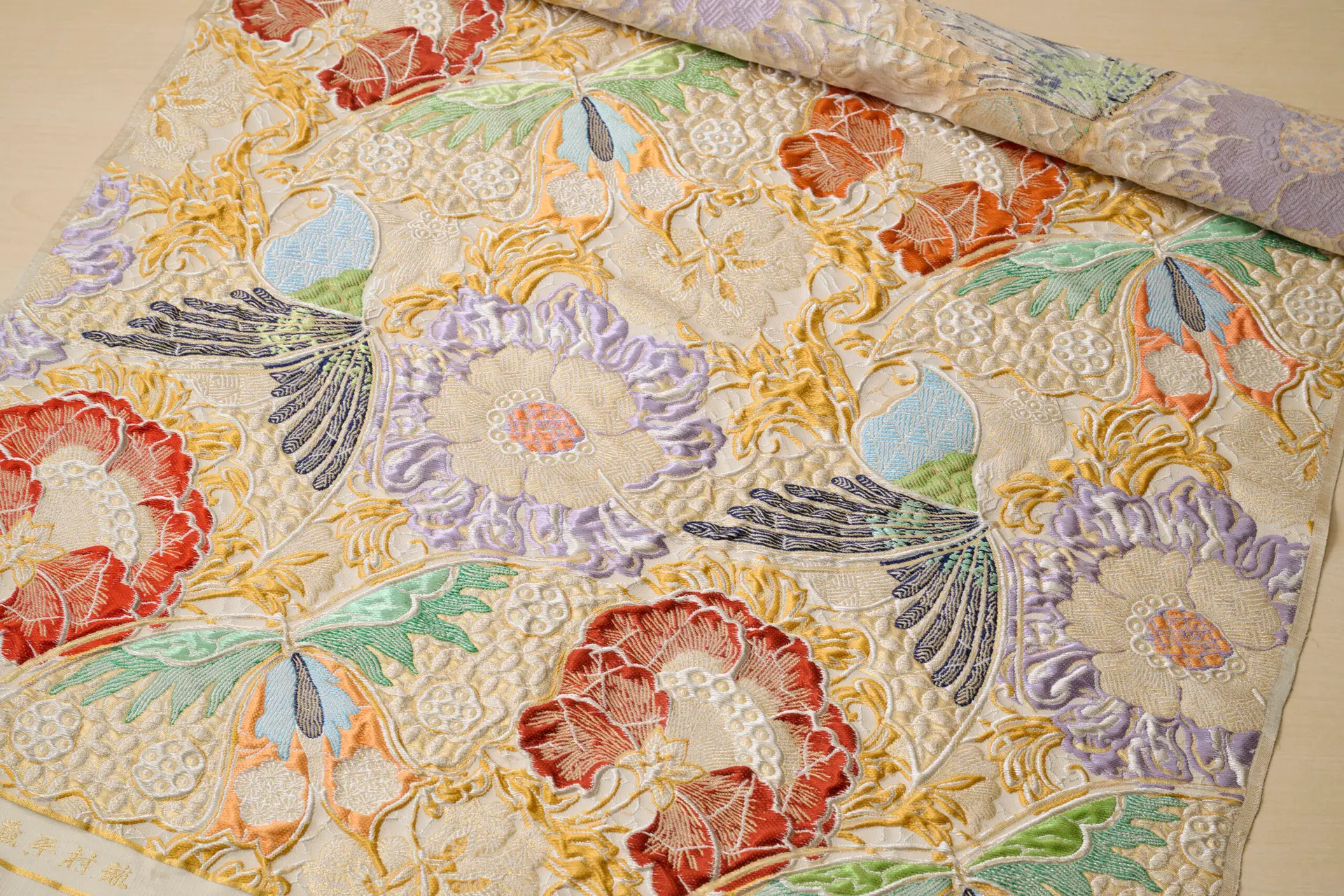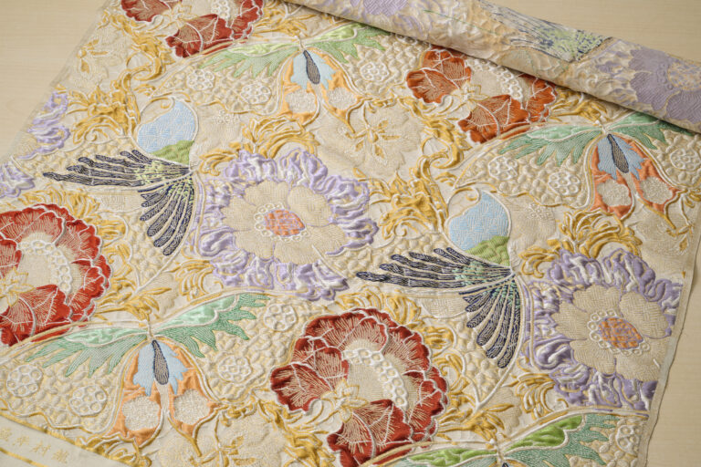 The distinctive feature of the aesthetic expression of Tatsumura brocade is made possible by being elaborate and adventurous at the same time. Time cannot deprive the innovative and original design of Tatsumura’s art brocade. Their works consistently reveal a beauty that will be instantly revealed as work by a Tatsumura craftsperson.
