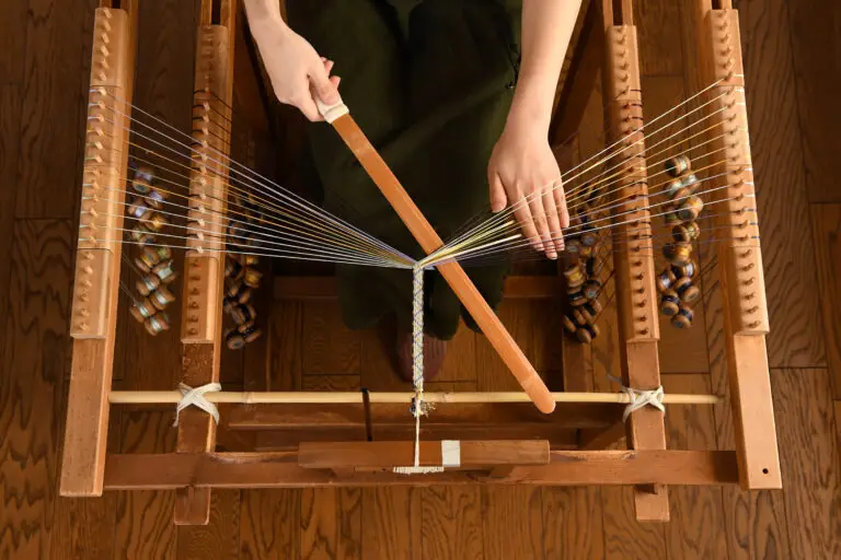 There are three major methods of textile production; weaving, knitting, and braiding. Braiding is done by diagonally overlapping a set of threads that are tied off at one end in a zigzag pattern creating an ever-lengthening cord.  The way the threads overlap is what gives kumihimo its beauty.