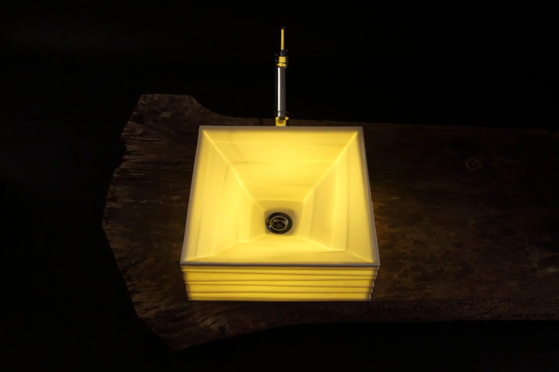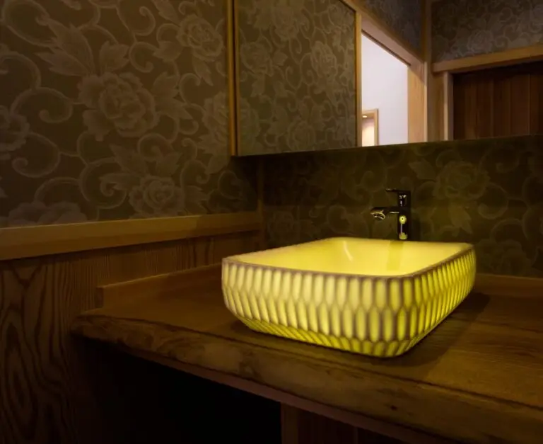 The glowing washbasin is an unprecedented product that is made possible by combining LEDs, which are energy efficient, have a long life, and are said to be the next generation light source. As a result of various tests, Yoshihisa has developed LEDs that are highly luminous, waterproof, and emit almost no heat.