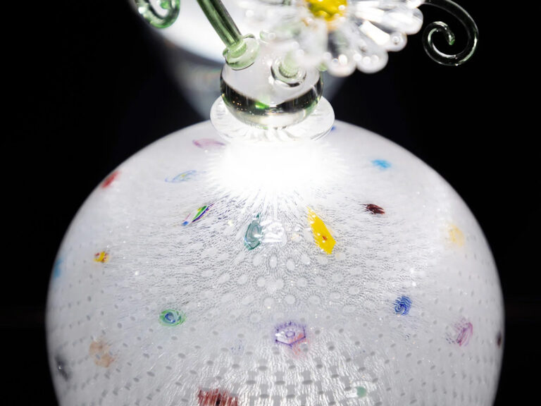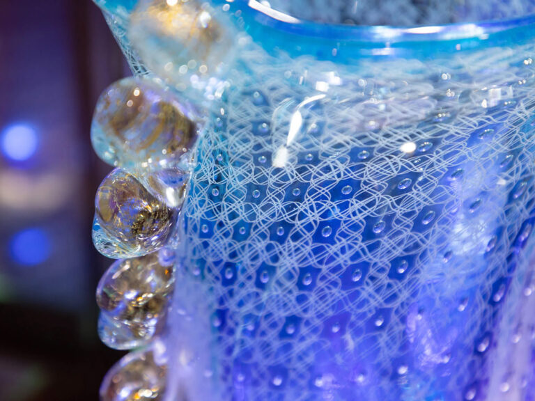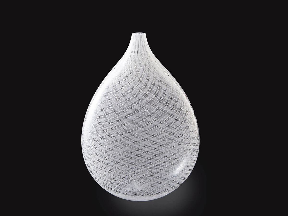 Taizo’s lace knitting patterns are made by stretching white glass wires very thinly, attaching them to the side of the clear glass, then twisting them to create the pattern. To make one type of lace rod, it is stretched as long as ten meters. The lines are arranged in a lattice pattern, and then an air bubble is placed between each lattice.