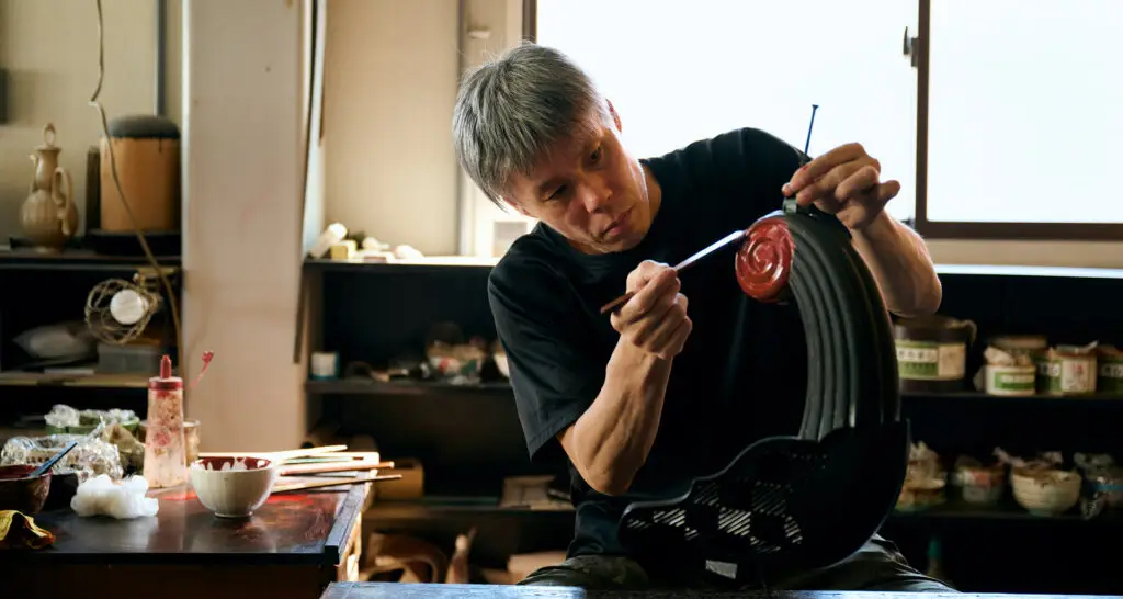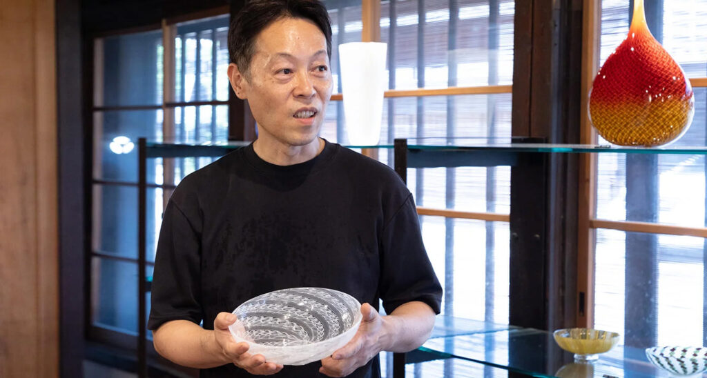 Taizo established his own studio in 1997. Toyama had a thriving medicine-selling culture of over 300 years, which led to the production of glass medicine bottles that became becoming popular during the Meiji and Taisho periods, with many glass artisans at its peak. Taizo is today one of the few people helping promote Toyama’s glass culture, and passing on the skills to the next generation.